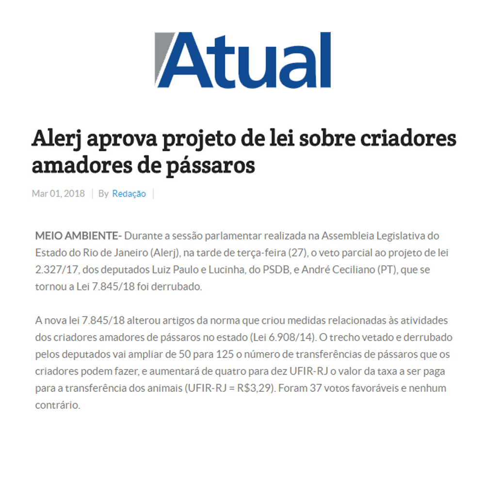 Jornal Atual – Alerj aprova projeto de lei sobre criadores amadores de pássaros