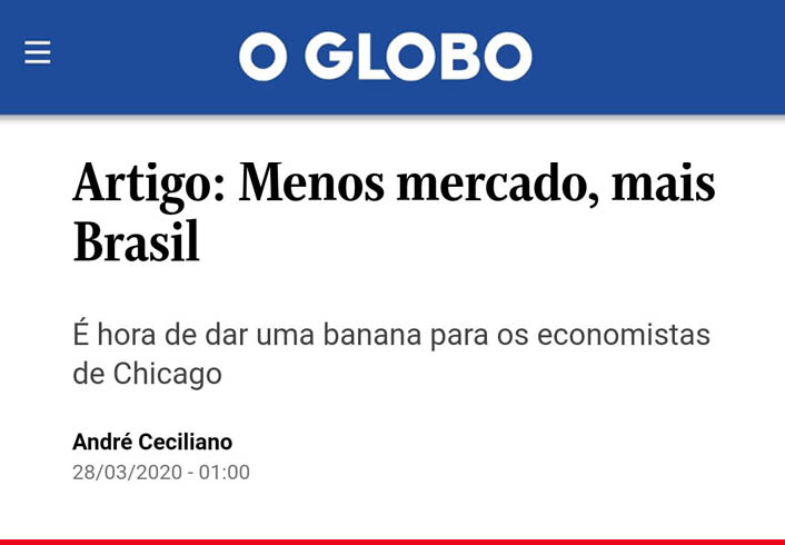 Menos mercado, mais Brasil É hora de dar uma banana para os economistas de Chicago O que diria Adam Smith, o pai da teoria econômica liberal, diante da situação da humanidade frente ao estrago causado na economia global pelo coronavírus? A “mão invisível do mercado” seria capaz de dar conta do problema? É claro que […]