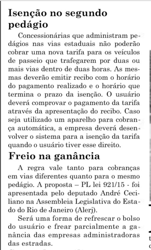 Jornal de Hoje publica projeto de lei de isenção de segundo pedágio